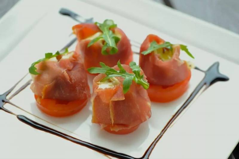 Scamorza Affumicata Con Prosciutto,这款简单的烤烟熏Scamorza奶酪令人讶异,奶酪包裹着切成薄片的意大利火腿。