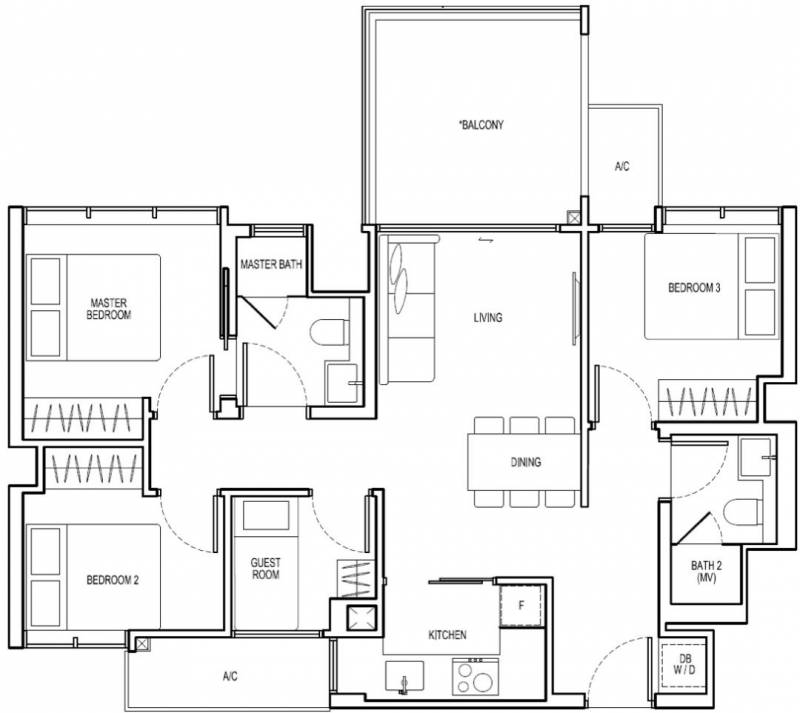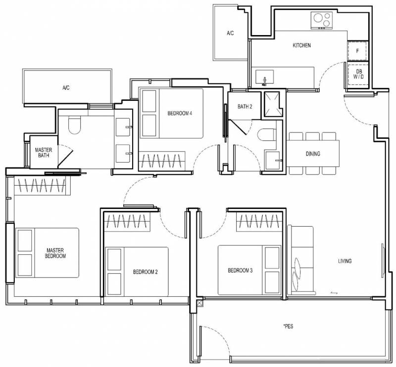 四卧室,套内面积94平方米(1012平方尺),四卧室只有一套,位于一楼,整套售价从172万元起。四卧室户型方方正正,所有房间均可放置双人床,配备内置衣柜。厨房相对独立,餐厅与客厅共享空间,客厅和其中一间普通房配备一个全封闭式阳台。这种房型特别适合有3个小孩的夫妻,或与父母同住的家庭以及出租给相关高端专业人士。