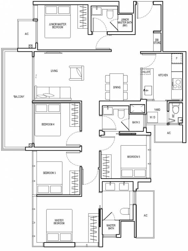 五卧室,套内面积118-120平方米(1,270-1,292平方尺),整套售价从197万元起。五卧室户型方方正正,所有房间均可放置双人床,均配备内置衣柜,其中一间为准主人房,配备室内卫生间。厨房相对独立,还有储藏间及小卫生间。餐厅与客厅共享空间,客厅和其中一间普通房配备开放式或全封闭式阳台。这种房型特别适合有3个或以上小孩的夫妻,或与父母同住的大家庭以及出租给相关高端专业人士。