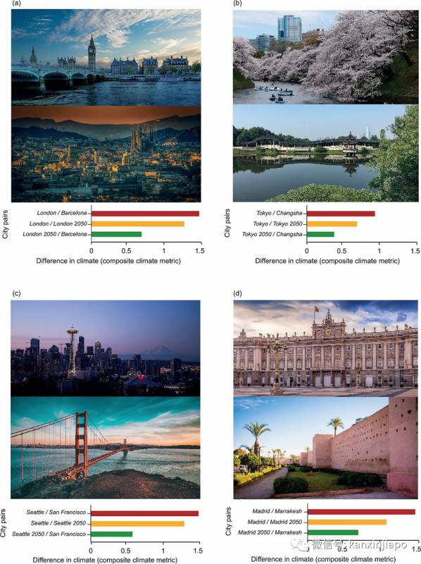 在2050年,蓝色区域的城市气候将更类似于现往南1000多公里地方的天气