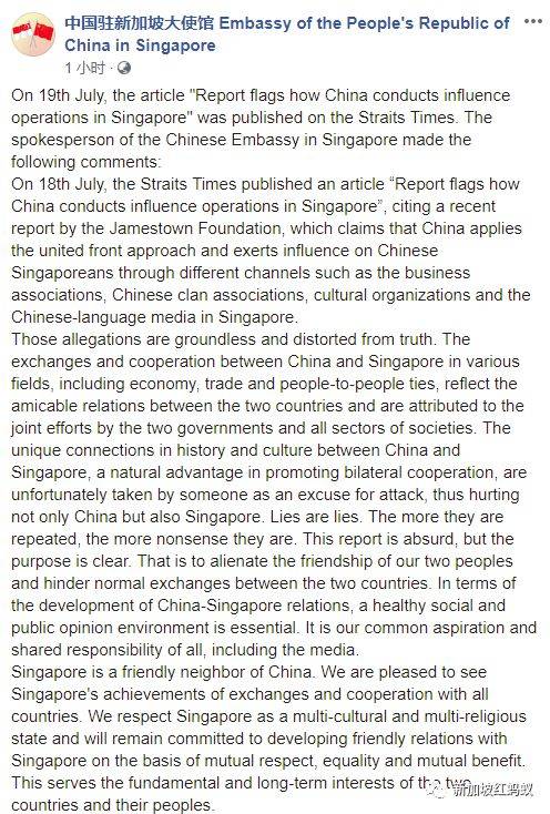 发言人通过面簿回应说,中新独特的历史文化渊源是推进两国关系的天然优势,却被一些人当成了攻击的口实,“这不仅是对中国的攻击,也是对新加坡的伤害。”