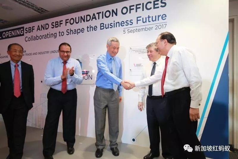 李显龙总理(中)于2017年9月5日出席新加坡工商联合总会中心(SBF Center)的开幕礼,其他嘉宾包括工商联合总会前主席李庆言(左起)、贸工部长(工业)易华仁、现任主席张松声,以及前主席朱良志。(联合早报)