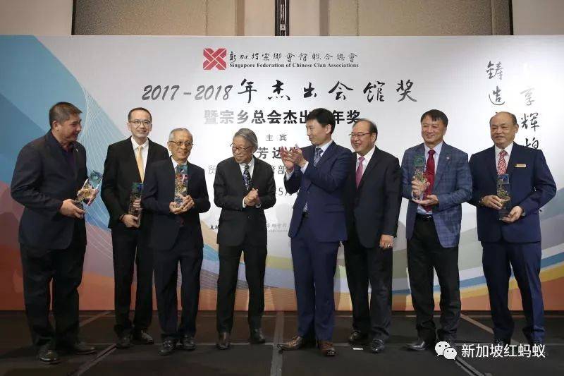 新加坡宗乡会馆联合总会所主办的2017/18年“杰出会馆奖”暨第二届“宗乡杰青奖”,于2019年5月11日在国敦河畔大酒店举行颁奖典礼。本届“杰出会馆奖”得主上台领奖后与主宾互动合影。左起:南安会馆副会长李家宏、晋江会馆会长卜清锺、武吉班让福建公会副主席苏汶通、评审团主席郭振羽教授、主宾徐芳达高级政务部长、宗乡总会会长陈奕福、茶阳(大埔)会馆会长何祥兴,以及永定会馆会长曾宪民。(联合早报)