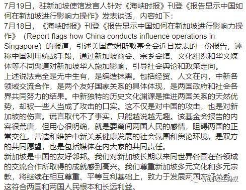 今晚,中国驻新加坡使馆发言人反驳美国詹姆斯敦基金会的报告称,“完全是无中生有,是编造抹黑”。