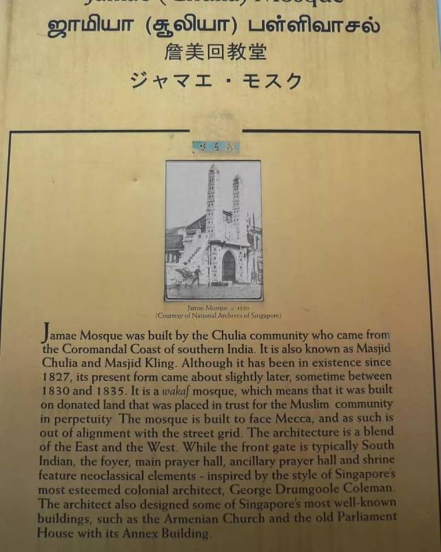 詹美回教堂 (Masjid Jamae) 是新加坡最古老的回教堂之一,自 1820 年代以来一直是牛车水 (Chinatown) 的一处著名地标。