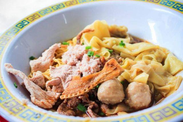 招牌肉脞面用料丰富,猪肝、肉沫、云吞、鱼干、葱花新鲜现煮,配各种酱料,口感一流