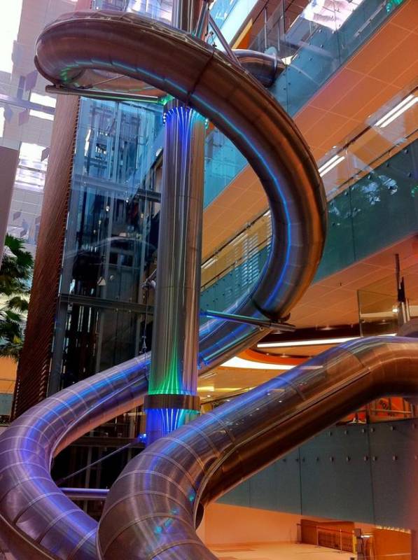 1楼到达大厅的室内滑梯高度达12米,足足4层楼,最快可以滑到6米/秒