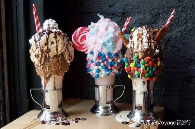 红蓝珍珠巧克力球、粉色波板糖、新鲜奶油及棉花糖絮点缀的Cotton Candy草莓奶昔,以及搭配水果味实心巧克力糖、脆香米、草莓挞和蓬松太妃糖丝的Bam Bam奶昔。每一款都拥有超高的颜值,每一款都是热爱自拍的姑娘们绝佳的道具。当然,每一款也都是热量爆表的炸弹,至于好不好吃,如果不是亲眼看着一个妹子一口口吃掉整整两大杯,我一定不会相信甜食也会有这样的魅力。