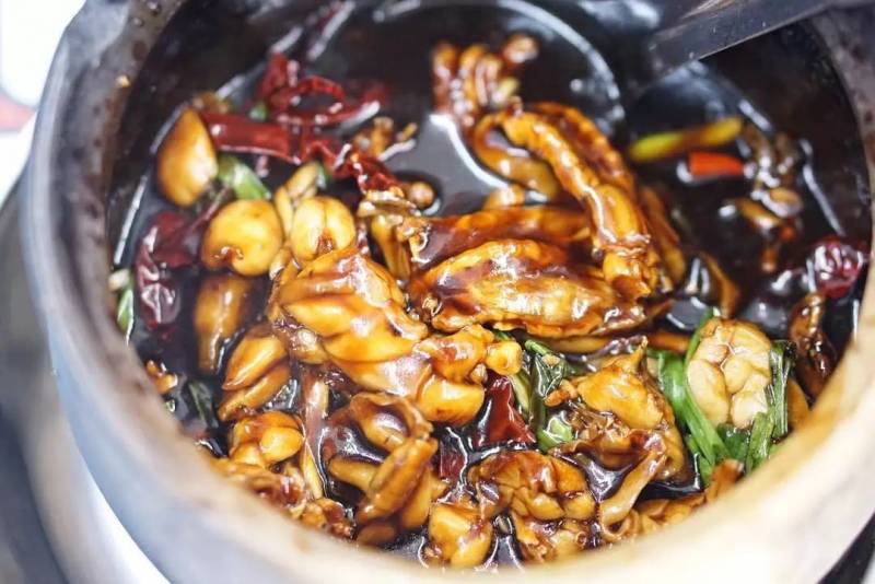 还有一个是宫保田鸡,算是川菜口味,甜咸辛辣,酱汁浓郁不腻,让无数食客赞不绝口。田鸡肉鲜活弹牙,丝丝入味,酱汁可以伴着白粥一起吃,盖住了些许咸味,但又是另一番风味。