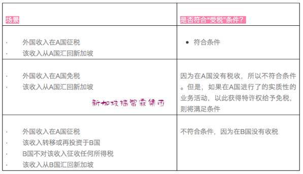 当指定居民纳税人于2003年6月1日或之后在新加坡收到从指定国家汇入的收入时,在符合相关条件后,将获豁免缴税。如果不符合条件,所述的税务待遇将正常发生。
