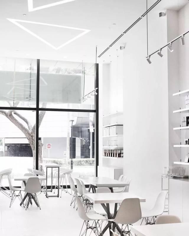 简单的纯白色内部,落地窗透过的自然光线。正是这种极简主义风格的装饰,让人可以放下烦恼,专注于品尝一杯咖啡。