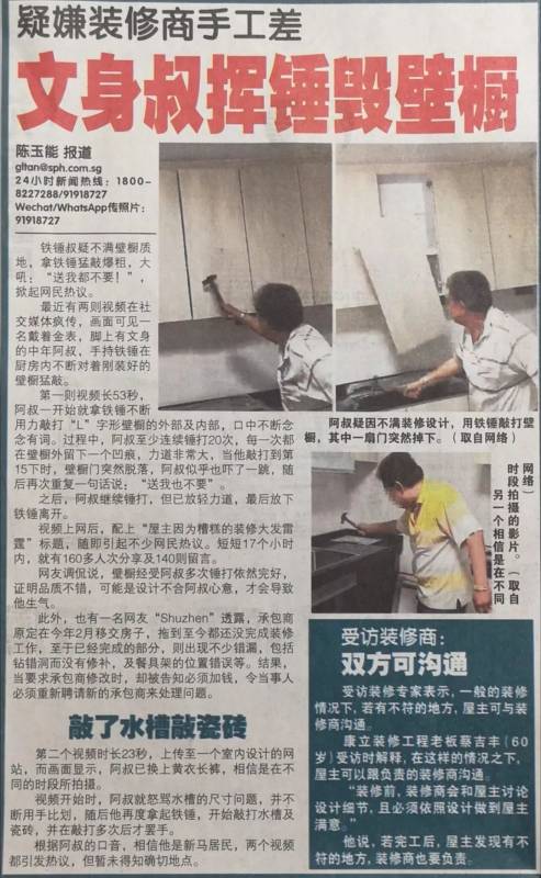 前段时间一则“安哥遭遇不良装修公司”的新闻上了报。一位新加坡的安哥原本抱着愉快的心要搬进新家,但一查看所有"家装",发现根本就变了调!不仅和原先谈好的设计完全不同,连已谈好的实心木橱柜,全变成空心三合板这种低劣的材质。要求厂商修改,竟然还要加钱,间接又要剥一层皮!气的安哥干脆全砸了!