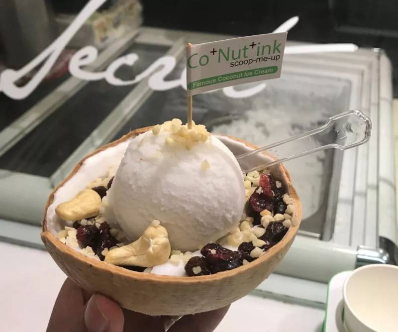 天气那么炎热,怎么能少了冰淇淋呢。经典椰子冰淇淋包装在一个新鲜的椰子壳中,浓浓的椰子味道,加上坚果和水果,口感超级丰富!除了这个还可以加其他topping,比如花生粉也不错呀~