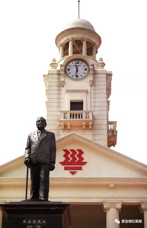 今年3月刚庆祝创校100年的华侨中学钟楼前的陈嘉庚像。(联合早报)