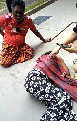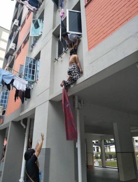 昨天上午11点多,在四美组屋,出现惊险一幕——一名女子上身半裸悬空挂在窗户外,一名男子奋力拽住她的头发。