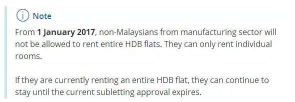 从2017年1月1日开始,制造业的WP准证持有者不再被允许整租一套组屋,只准租自己的单个房间。如果已经租下整套组屋,在租约满之后不再允许。