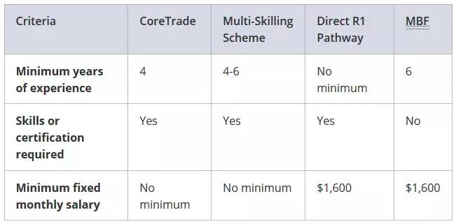 整体来说,WP分为R1和R2两级。具体的分级方法,不同行业(五个行业)有不同的要求,比较复杂。简而言之,R1和R2在逗留期限、外劳税和人头配额方面都有所不同,具体行业具体分析。看下建筑行业,感受一下分类的复杂性。