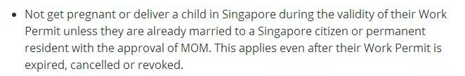 c.关于WP是否能在新加坡怀孕,分情况。除非是已经在人力部许可,并且和新加坡PR/SC结婚的情况下,才可以在新加坡怀孕或者诞下宝宝,否则是不允许怀孕和生产的。 (不管准证是在有效期范围内还是已经过期或者取消掉,都是按照这一政策。)