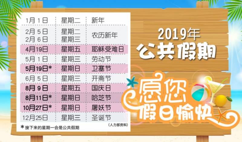 明年有两天公共假期落在星期五,分别是2019年4月19日耶稣受难日,以及8月9日国庆日。这些假期都能让国人有连续三天的休息日。