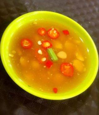 这也是一家要排队的鱼汤店,和别的鱼汤店不同的除了它橱窗式雪柜里挂着的整只大鱼外,应该就是它的自制蘸酱了- 黄豆豉混合红辣椒,很有独特的风味。