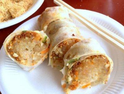 薄如纸片的饼皮裹入萝卜、豆芽、生菜、鸡蛋、花生等好几种食材,配上不同的酱料,切片,清爽美味。无论是做为正餐,还是饭后点心,都是补充蔬菜的不错的选择。