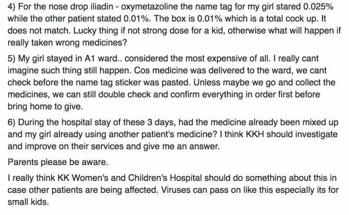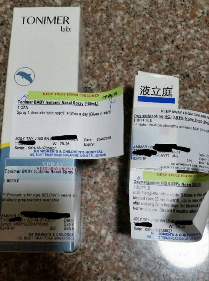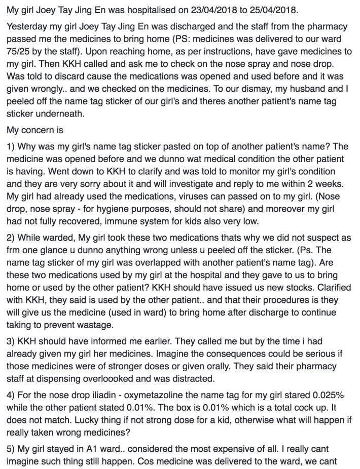 女孩的妈妈Lau Jia Hui在Facebook上发文写到,其女儿在4月23日至25日期间在KK住院,25日出院后便带着医院开的药回家。回家后孩子妈按照医嘱给女孩服药。然而一段时间后,医院打来电话,让她检查滴鼻子的药水,并通知她说那些药物已经被打开过,请立即丢弃不要使用,同时也告知这些药可能给错了。细心的孩子妈撕下贴在药品盒子上的女儿名字标签后发现,下面还贴著另外一个孩子的名字标签!