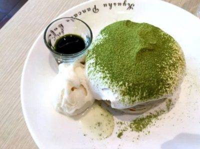 三个松饼淋上厚厚的马斯卡彭乳酪和抹茶粉搭配抹茶酱和香草冰淇淋。那层乳酪口感非常美好,量很足,一直吃到最后都是乳酪,每层松饼之间还夹着抹茶酱。