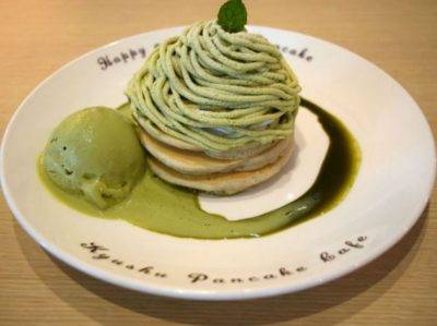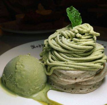 叠起来的三个松饼顶上厚厚一大坨抹茶蒙布朗,厚厚的涂一层在松饼上面,就好像在吃抹茶奶油裸蛋糕。这种酱要比提拉米苏更厚重一点,不湿润,所以松饼的谷物味道会更浓郁一点。