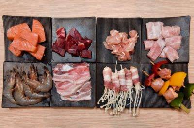 肉类方面有五花肉、鸡肉、牛肉、猪肝、猪颈肉、熏鸭、猪肉串等等。