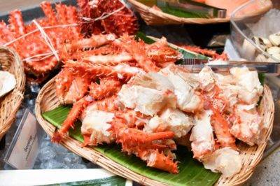 自助餐台上不是只有生冷食材,也有已经煮好的几道熟食,如泰式青咖喱、辣炒蛤蜊、冬粉扇贝、泰式蒸鱼片、炸虾、酿蟹、炸鱼片等等。