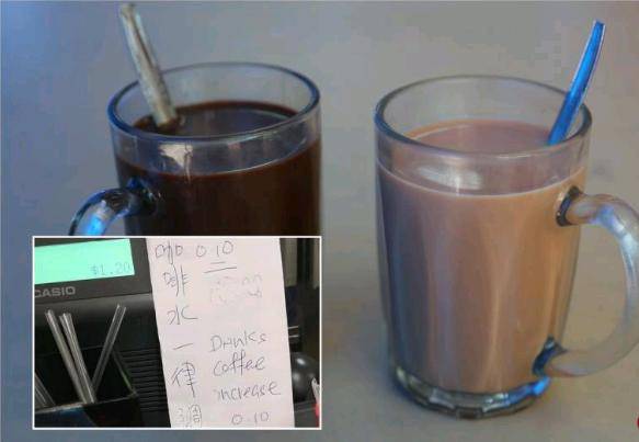 在碧山13街的金山岭咖啡店,发现茶水档贴上手写的告示,内容为“咖啡水一律涨价一角”。