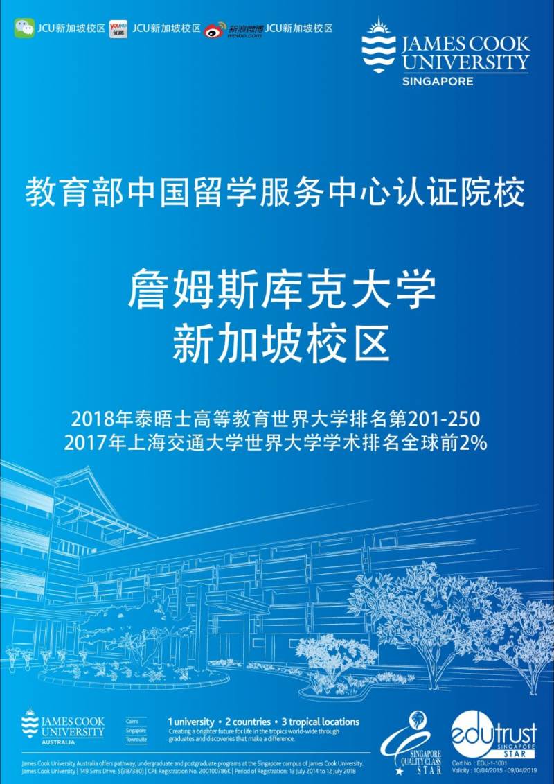 广告詹姆斯库克大学新加坡校区是新加坡第一所获得教育信托星级认证(EduTrust Star)的院校,并且于2016年荣获新加坡素质等级星级认证(SQC Star)。大学于2018年初获得中国(教育部)留学服务中心学历学位认证!