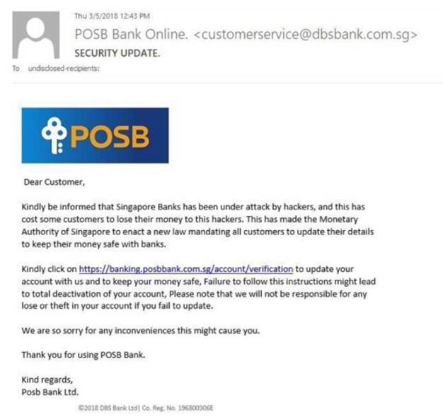 邮件当中表示,许多新加坡银行遭到黑客袭击,说很多人的银行户头中的钱遭盗窃,因此当局下令所有银行顾客必须更新个人资料。电邮中提供了网址,还言之凿凿说若不更新资料,银行账户持有者可能失去部分金额,甚至账户被冻结。