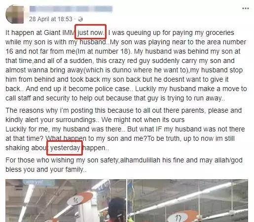 前天(4月28日),有一名网友在Facebook上分享自己小孩子差点被陌生人强行抱走的惊险经历,该帖被转载6千多次!