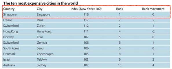 总部在英国的经济学人智库(EIU),周四在伦敦公布全球各地城市的生活费用指数(Cost of Living Index)显示,新加坡生活费够吓人,连续5年名列榜首,蝉联全世界生活花费最贵的城市。