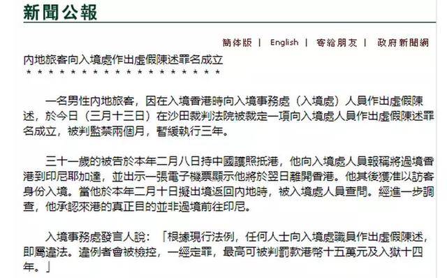 当时他向海关展示了去印尼的机票,但被查出来,实际并没有离开过香港,被香港海关认定为虚假陈述,在沙田裁判法院被裁定一项向入境处人员作出虚假陈述罪名成立,被判监禁两个月,暂缓执行三年。