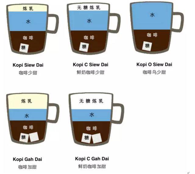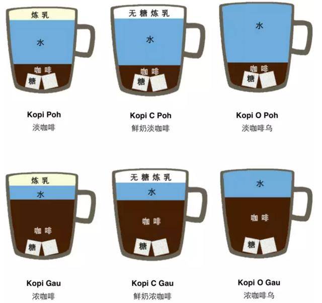 Kopi O=咖啡+糖(O发音为“哦”,其实是新加坡福建话,也就是闽南话里“黑”的意思)