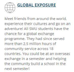 这些项目包括学生和学校组织的海外探险或考察活动、文化浸濡等等。与此同时,新加坡管理大学还将增加经济援助,借此确保学生不会因为经济问题而错失海外交流的机会。