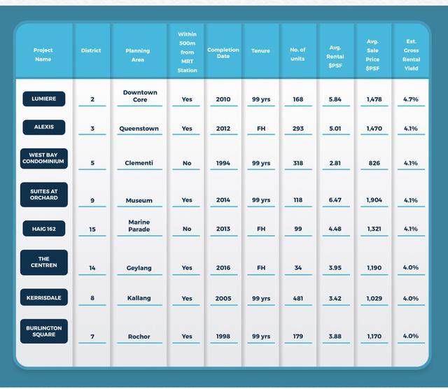 那么,什么是真正值得的房地产投资?对于答案,我们考察了新加坡各地的总体租金收益率为4%以上的公寓,通过数据对比以确定它们的共同特征。