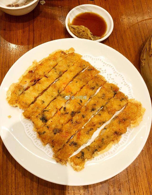 腐皮炸虾饼,表皮的腐皮炸的酥酥脆,里面的虾饼可以吃到大颗Q弹的虾肉粒,蘸上点辣椒油特别好吃。