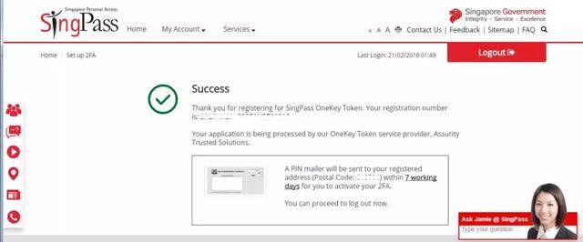 6)荧幕上出现“Success”(成功)字样和申请编号。你会在X天之内收到一封信(寄到你家住址,请查看邮箱),告诉你启动SingPass 2FA的密码。