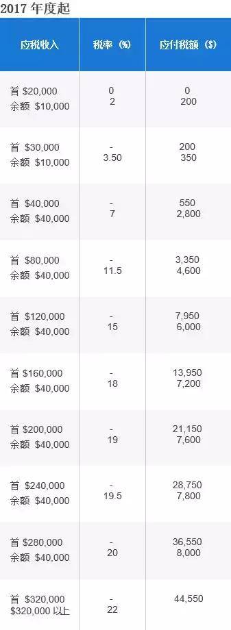 例如: 年总收入$35,000, 前30,000的税额为$200,余额5,000的税额是5,000X3.5%=$175, 所以总税额为$375。