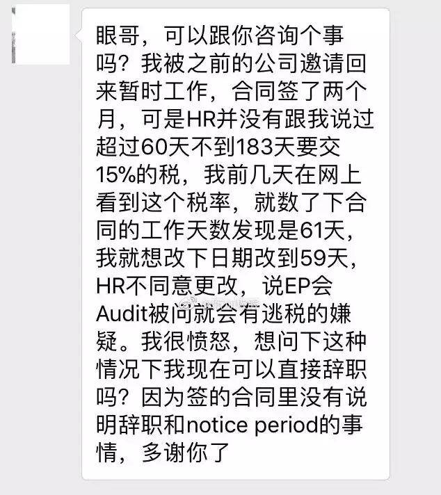 还有:"您好,我想咨询一下缴纳个人所得税的问题,外国人第一年是免税的对吗?如果按照EP开始时间,不到一年,换了一个工作,然后第二份工作依然按照EP只有两个月,需要交高昂的税费吗?"