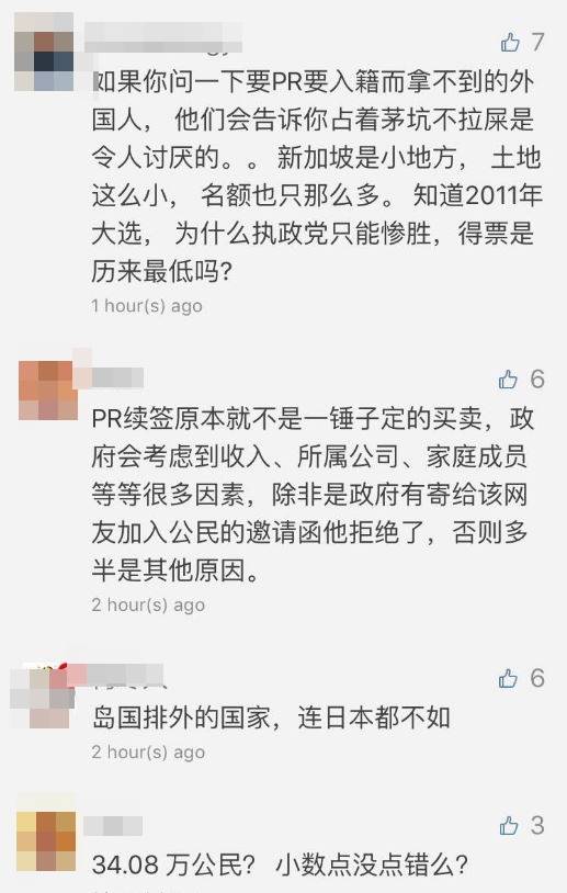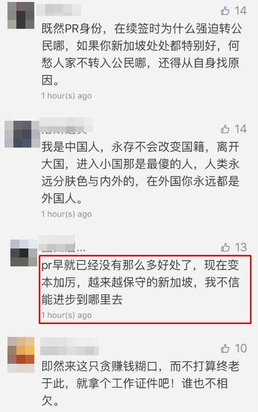 而对于新加坡政府来说,PR享有永久居住在这里的权利,但又无法履行像公民一样的义务看到这个消息,有网友表示,新加坡还是缺乏给外国人融入这里的机会,还有的说,辛辛苦苦在新加坡打拼这么些年,好不容易拿到个PR,不想成公民就打回原形?是不是有点不地道。