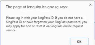 但是,查询结果还是要用到SingPass账号,点击移民厅Check application status/pass validity (iEnquiry)之后,虽然在上面有显示“有Singpass”和“无Singpass”两个选项,但是当你点击“无Singpass ”,输入回执号和准证号码之后,会直接弹出下面的页面