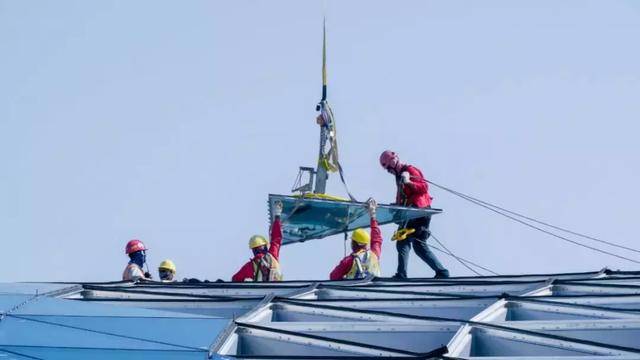 确认没有问题后,才使用液压泵和起重机将每块重达300公斤的玻璃安装到特定位置上。