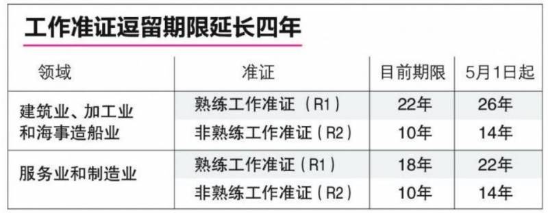 目前,非熟练工作准证(R2)外劳最多可在新加坡工作10年、熟练(R1)外劳若在服务和制造业工作可以逗留长达18年,建筑、加工和海事造船业的工作准证则可逗留长达22年。一旦各领域都延长四年后,新加坡工作准证外劳的逗留期限最长是26年。