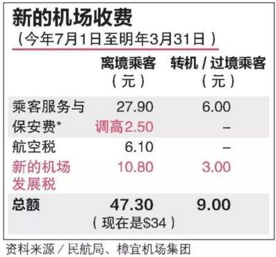 转机或过境乘客的服务与保安费则没有调整,维持在6元。
