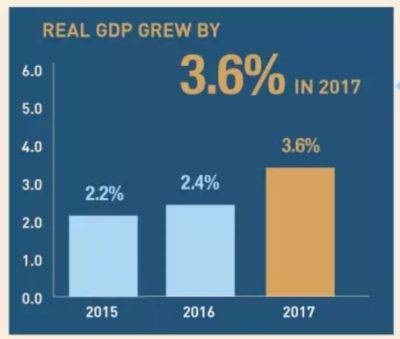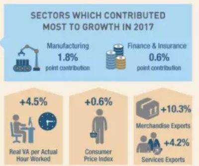 2017年初,由于2016年经济增长水平差强人意,而且全球经济形势严峻,贸工部预测经济增长幅度在1.5%到3.5%之间。今年的经济增幅超出预期,部门将此归功于市场的强势表现。