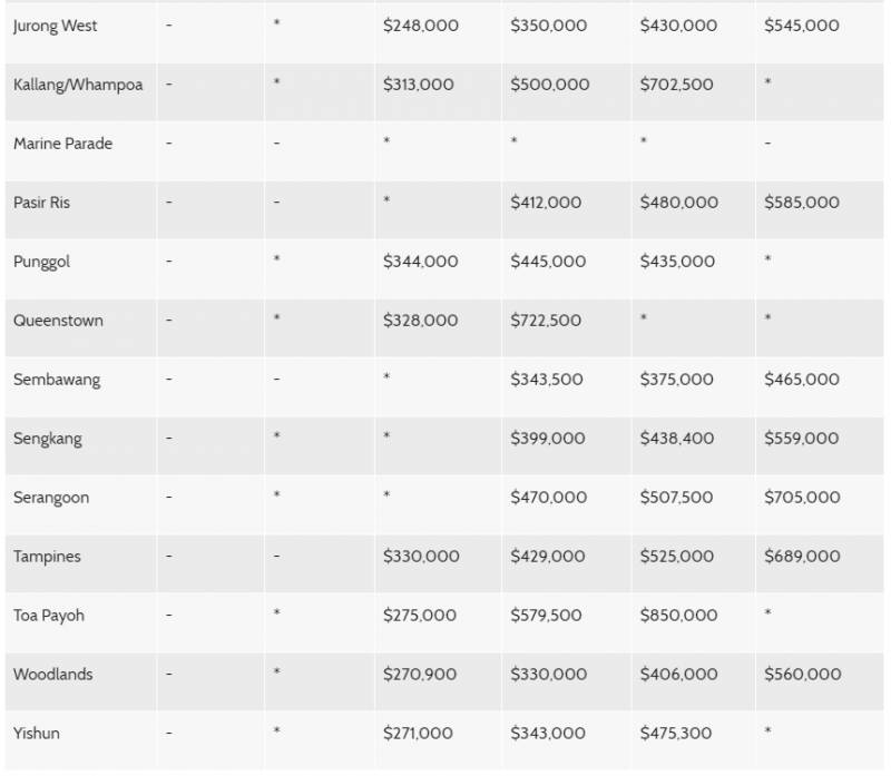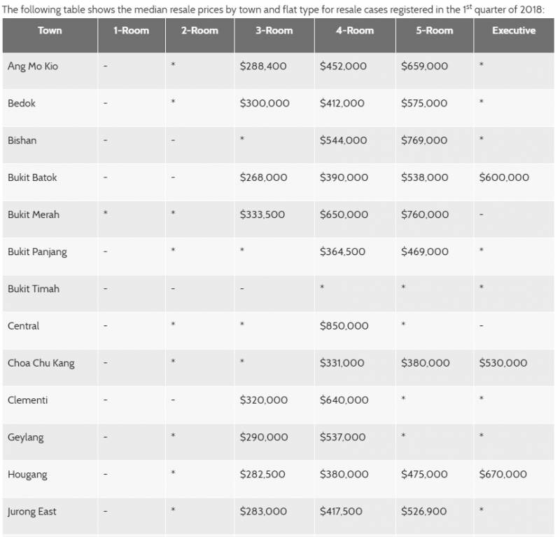 The following table shows the median resale prices by town and flat type for resale cases registered in the 1st quarter of 2018: (最新更新2018,4-5月)